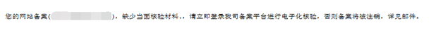 當(dāng)您收到我司任一核查通知時(shí),您需根據(jù)提示在整改期內(nèi)對(duì)備案信息進(jìn)行整改。如果您未在整改期內(nèi)完成修改,您的備案可能會(huì)被我司取消接入或被管局注銷,從而導(dǎo)致您的網(wǎng)站業(yè)務(wù)受影響。