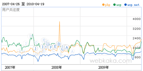 ????? 上圖為近3年的php,asp,asp.net用戶(hù)關(guān)注度比較,從圖中曲線(xiàn)圖看出,php在2008年下半年開(kāi)始受更多用戶(hù)關(guān)注,從2008年下半年到 2009年上半年,php與asp不分上下,受關(guān)注程度幾乎是一樣,而從2009年下半年開(kāi)始,php受用戶(hù)關(guān)注度已經(jīng)明顯超過(guò)了asp,而 asp.net的用戶(hù)關(guān)注度僅僅為php的1/2。