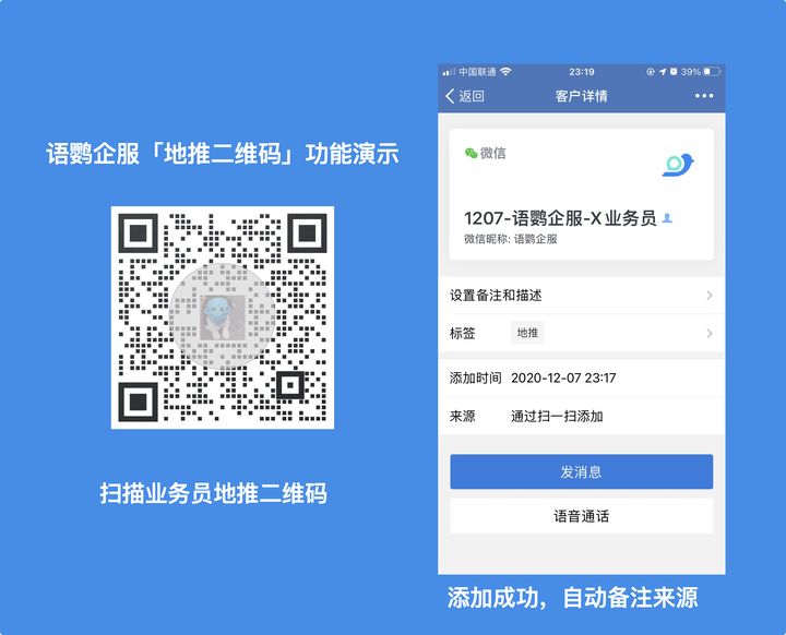 這就要用到語鸚企服私域管家的渠道活碼了。如圖所示,客戶通過掃描業(yè)務(wù)員地推二維碼加到客服,客服就能夠清楚的知道客戶是哪個業(yè)務(wù)員帶來的。管理員也可以根據(jù)地推效果給予業(yè)務(wù)員一定的提成獎勵。