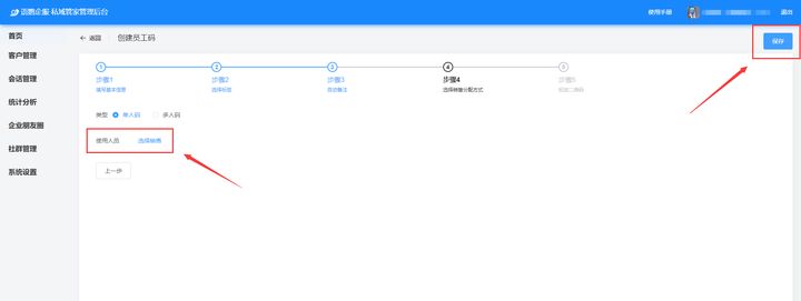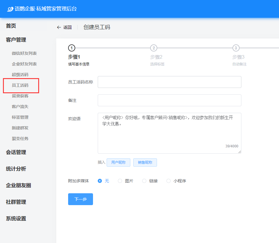 登錄語鸚企服管理后臺,通過員工活碼功能模塊即可創(chuàng)建地推二維碼。這里為了方便查看,你可以將活碼名稱設(shè)置為業(yè)務(wù)員名稱,然后配置添加后自動發(fā)送的歡迎語,歡迎語可以添加文字、圖片、鏈接、甚至是小程序。
