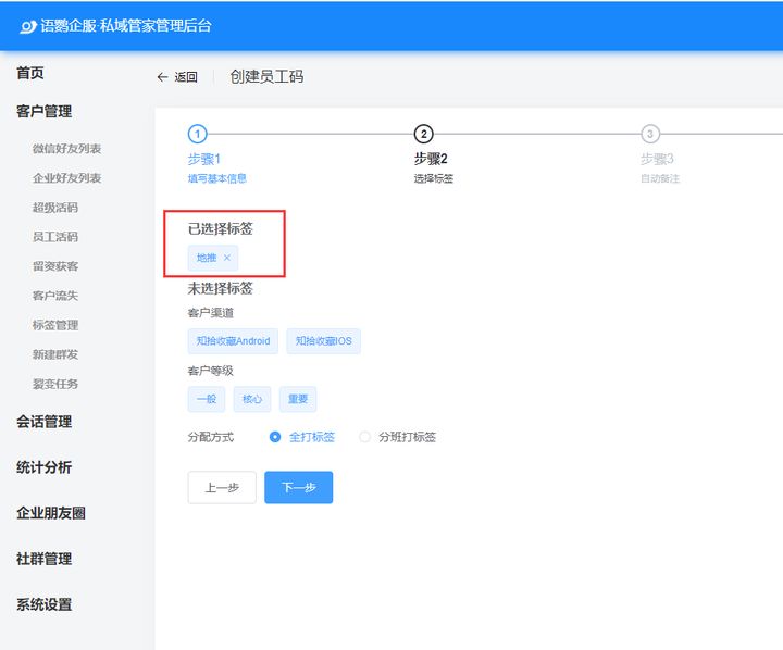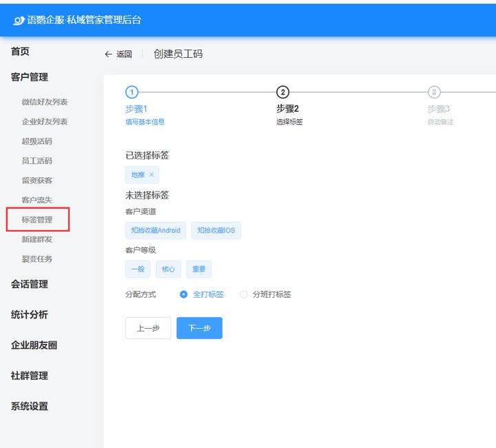 通過標簽管理創(chuàng)建一個“地推”的標簽,然后選擇該標簽,這樣掃碼添加的客戶都會自動打上“地推”標簽,更加清晰的知道客戶是通過地推加過來的。
