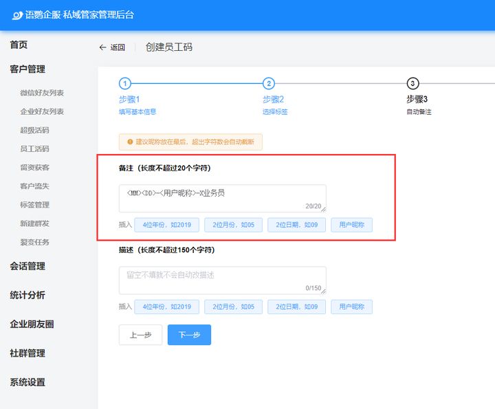如果我們想清晰的知道是哪個業(yè)務(wù)員添加的客戶,在備注那里可以設(shè)置為:日期-用戶昵稱-業(yè)務(wù)員名字,這樣客戶加過來,就可以直接在客戶昵稱上看到他是哪個業(yè)務(wù)員邀請過來的,從而進行統(tǒng)計每個業(yè)務(wù)員拉客戶的數(shù)量。